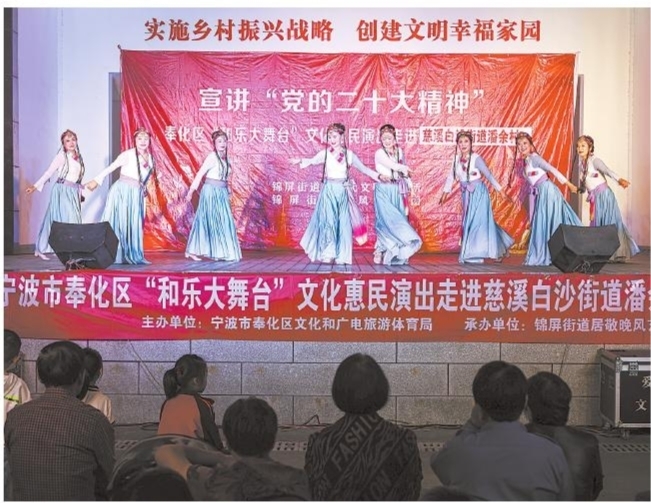 日前,奉化区“和乐大舞台”文化惠民演出走进白沙路街道潘余村。21个文艺节目既宣讲了党的二十大精神,也为村民送来了文化大餐。
