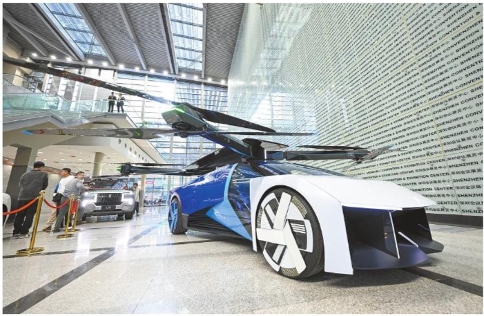 11月15日,在第二十五届高交会上,机臂、旋翼等飞行系统可以完全折叠收纳的小鹏汇天陆空一体式飞行汽车对公众展出。 当日,第二十五届中国国际高新技术成果交易会在深圳开幕。105个国家和地区团组、4925家企业参会参展,展会总面积达到50万平方米,是史上规模最大、参与国家和地区最多的一届高交会。 ■新华社发