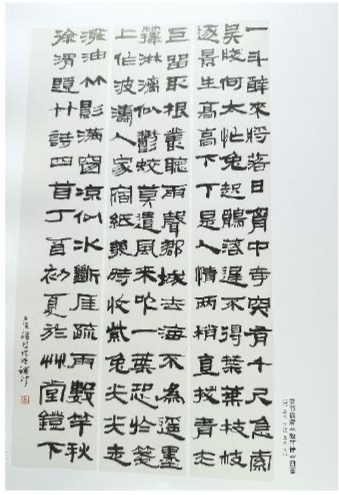 徐光强一生执教,但在书法一事上执着刻苦。因为课业多,白天没有时间,只能晚上用功。每天备完课后,他就开始临帖,临到睡着才罢休,因此常常写到半夜受到妻子埋怨。那时的居住条件很差,乡下还没有电灯,用的是煤油灯、蜡烛,光线昏暗,十分费眼神。尤其是夏天,特别艰难,脚上高筒靴防着蚊子,闷热得很,一会儿工夫全身都湿透了。那么多年,临摹的功夫都是靠这一点一滴积累下来的,二王的《集王圣教序》他反反复复临了十多年。入选中书协展览的那件白居易的《冷泉亭记》,前后写了260多遍,才从中挑了一幅投稿。“记得当时中书协的刘艺先生面对面点评我的入展作品,认为小行书写得很美,建议我习魏碑和隶书,飘逸潇洒的线条如果加上厚重古朴,这样将会更耐看。”从此徐光强开始了对这两种书体的学习。