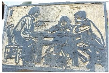 徐光强从角落里拿出了一幅版画。这是一幅很有年代感的木刻作品,画面中,一个农村的老妇人正在给两个孩子讲述着什么……三人围坐在一张方桌旁,桌上放着一个豁口的大碗,桌腿旁是只竹编篮,两个孩子端坐在凳子上,听得很认真。徐光强说,那个时候这种情景很普遍,讲得最多的就是忆苦思甜。二十世纪五六十年代,他曾被宁波地区推选为中国首届工农兵美术代表大会代表并任宁波地区组长。尽管后来主攻书法,但他对画画的热忱一点没有消退,而是随身携带一本速写本,随时记录,慢慢地也攒了好多,后来印发过《徐光强速写选》。