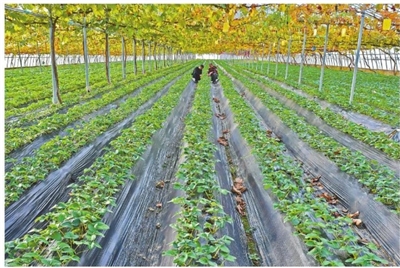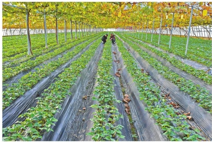 11月22日,农民在山东省烟台市福山区门楼街道肖家村碧树农园管护草莓。当日是小雪节气,各地农民抢抓农时,进行农作物种植、管护、采收等农事活动。■新华社发