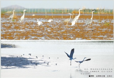 近日,鹭鸟在杭州湾湿地上或栖息、觅食,或翩翩起舞,成为一道亮丽的生态景观。 ■摄影 全媒体记者 王烨江