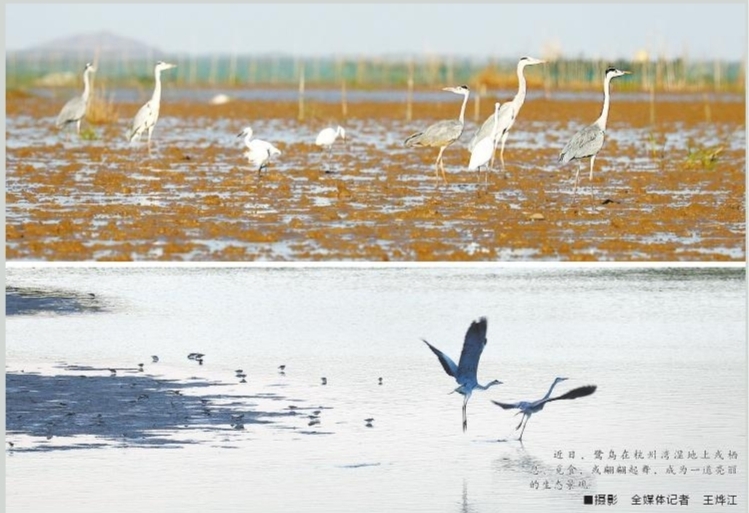 近日,鹭鸟在杭州湾湿地上或栖息、觅食,或翩翩起舞,成为一道亮丽的生态景观。