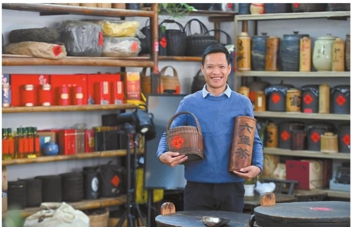 在梧州市苍梧县大泽六堡茶业有限公司,六堡茶制作技艺非遗传承人韦湛生展示六堡茶(12月5日摄)。 原产于广西梧州市苍梧县六堡镇的六堡茶,距今已有1500多年种植历史。六堡茶属于我国茶叶品类中的黑茶,素以“红、浓、陈、醇”著称,其制作工艺被列入第四批国家级非物质文化遗产代表性项目名录。近年来,梧州市不断做大做强六堡茶产业,推动产业发展升级,构建全产业链现代产业体系,六堡茶产业呈现产销两旺、量价齐升的良好发展势头,成为联农带农富农、助力乡村振兴的特色产业。 ■新华社发