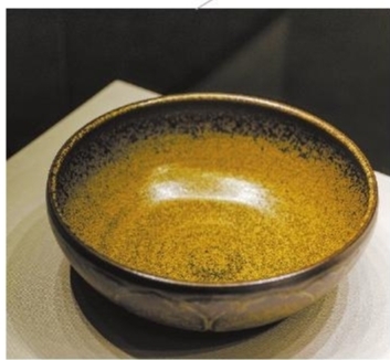 “不凋·桑叶跳刀纹天目碗”,将永和落叶法用于跳刀纹黄土釉浅碗中,经茶山窑81小时还原焰长烧而成,瓷胎充分烧结,釉面遍布银色的铁质晶花,桑叶舒展地居于碗心,已然演化成永不凋萎的植物化石。作者用木叶天目碗诗性的语言,表达了对生命与文明的感言。
