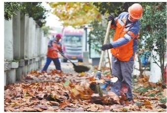昨日气温骤降,风吹落叶满地黄,在桥城的街头巷尾,随处都能看到环卫工人忙碌的身影。■摄影 全媒体记者 王烨江