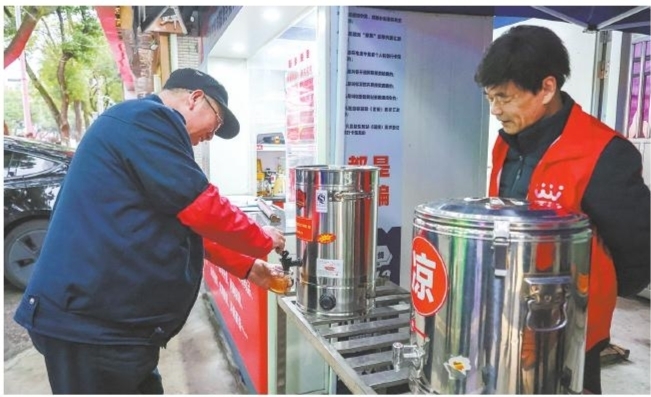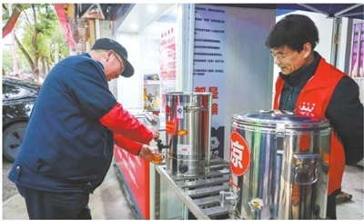 近日,古塘街道志愿义工银行匿名爱心志愿者捐赠了即时加热储水壶,向户外工作者和过路的行人提供免费的暖心姜茶,在寒冷的季节里带来浓浓暖意。 ■摄影 全媒体记者 蒋亚军 通讯员 奕碧琼