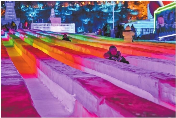 12月12日,游客在长春冰雪新天地体验冰滑梯。当日,第27届长春冰雪节在长春冰雪新天地举办开幕式。长春冰雪新天地占地156万平方米,打造冰雪丝路区、冰雪影都区等5大主题区域,设立30余项冰雪娱乐项目。■新华社发