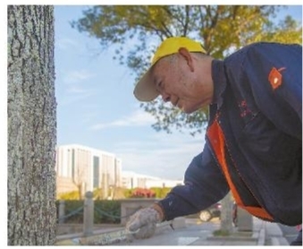 昨天,城管及园林工作人员正在给人民广场旁行道树穿上“冬衣”,提高树木防冻抗寒能力,确保安全过冬。 ■摄影 全媒体记者 黄凯 通讯员 陈浩杰