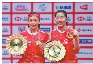 12月17日,陈清晨(左)/贾一凡在颁奖仪式上。 当日,在杭州举行的2023世界羽联世界巡回赛总决赛女子双打决赛中,中国组合陈清晨/贾一凡以2比0战胜韩国组合白荷娜/李绍希,获得冠军。 ■新华社发