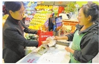 近日,中信银行宁波桥城支行带着“拒收现金违法”字样的小贴士、零钱包、现金告知书等物品,走访城北社区网格内经营主体,宣讲人民币现金的国家法定货币地位和兜底支付作用,宣传银行开展“零钱包”兑换等现金服务的工作措施,推动现金法偿的观念深入人心,在全社会进一步凝聚拒收现金违法的共识,持续提升现金服务便利化水平,优化现金流通服务环境。 ■摄影 通讯员 史曼娜