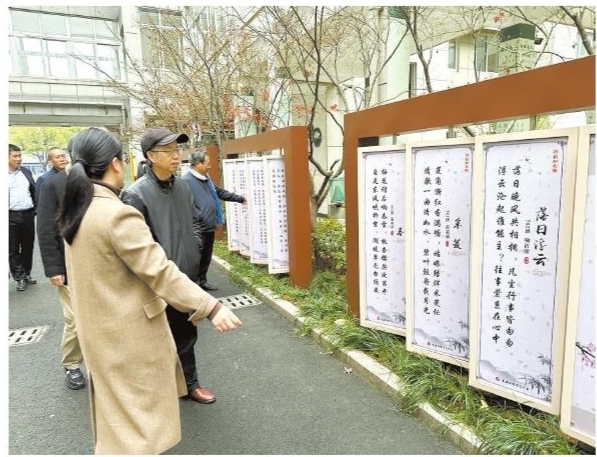 中华诗词蕴含着丰富的思想情感和独特的文化内涵,承载着中华民族的璀璨文明和绮丽人文。我市高度重视做好“中华诗词之市”建设“后半篇深化文章”,把诗词文化建设摆上重要位置,并融入城市文化形象规划工作中。鸣鹤景区环白洋湖步道,按照“诗道”的要求精心设计建设,而鸣鹤古镇的金仙寺则成立“白湖诗社”。在伏龙山、达蓬山、方家河头、上林湖、沿山线等旅游景点创设诗词文化,促成旅游与诗词相融相成、双向提升。同时,建设标志性的诗词文化设施或建筑,在城区峙山公园、虎屿山小山墩、森林公园等人流量大的地方建立诗词活动基地,在公共空间布设固化的诗廊、诗墙、诗碑。崇寿镇傅家路村的诗廊,横河镇孙家境村的诗碑,鸣鹤古镇的“八景”诗石凳和石柱,逍林初中的科学家专题诗廊,周巷镇万安庄村的诗墙……这座日新月异的现代化城市无处不洋溢着诗情画意。