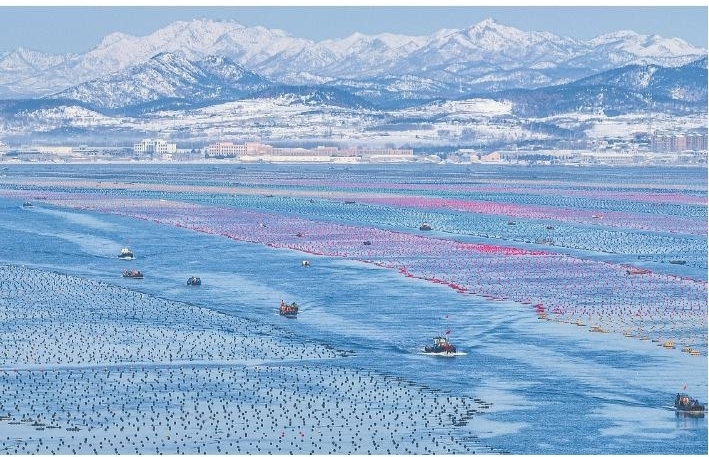 最近,在山东省荣成市各大海洋牧场海上养殖区,渔民们趁着雪后晴好天气,驾驶渔船出海,开展各类海上生产作业,呈现出一派海上冬耕的繁忙景象。