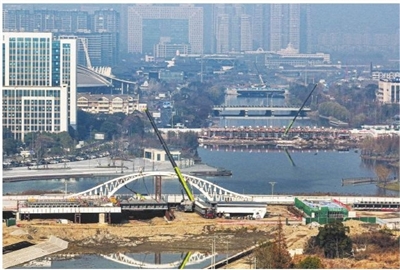 目前,新城河二期四座桥梁建设正在紧张有序进行中。其中,慈甬路桥装饰拱北拱已基本成型,图为12月27日记者远距离俯拍项目建设场景。 ■摄影 全媒体记者 蒋亚军