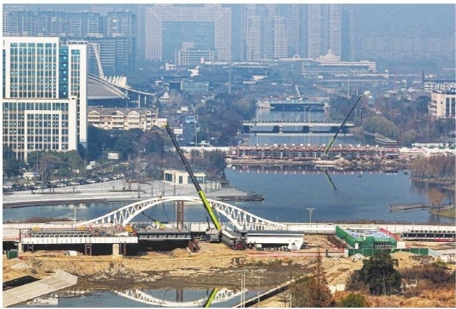 目前,新城河二期四座桥梁建设正在紧张有序进行中。其中,慈甬路桥装饰拱北拱已基本成型,图为12月27日记者远距离俯拍项目建设场景。