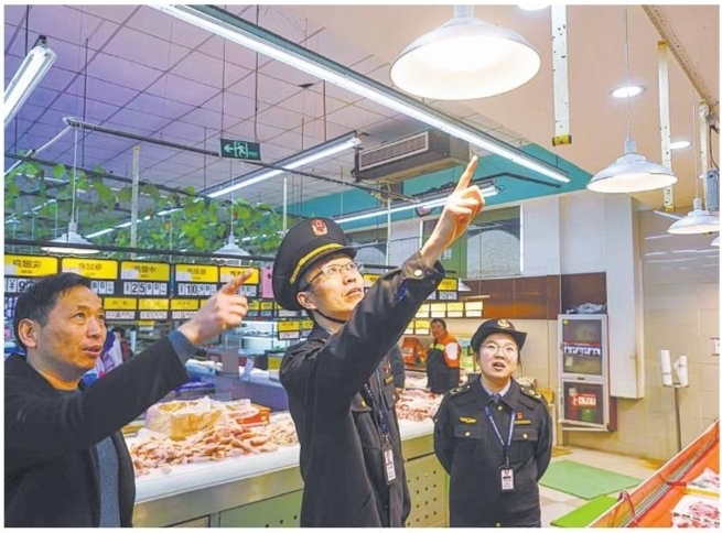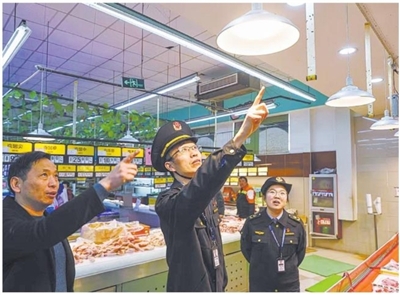 12月1日,《食用农产品市场销售质量安全监督管理办法》正式实施。近期,市市场监管局对全市农贸市场、中大型超市、生鲜店等场所开展生鲜食用农产品“生鲜灯”检查。图为胜山市场监管所执法人员在一超市检查“生鲜灯”使用情况。