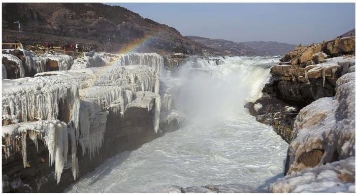 这是1月2日在黄河壶口瀑布景区拍摄的“冰瀑飞虹”。 当日,位于山西吉县和陕西宜川县交界的黄河壶口瀑布出现“冰瀑飞虹”景观。 ■新华社发