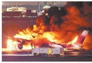 这是1月2日在日本东京羽田国际机场拍摄的起火客机。据日本广播协会1月2日报道,日本航空一架空中客车A350客机疑似与海上保安厅飞机相撞,在羽田机场跑道起火。■新华社发