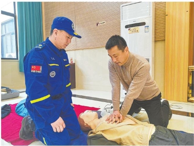 近日,宗汉街道红十字会携手慈溪阳光蓝天救援队在百两村文化礼堂开展“急救宣传进礼堂”活动,指导村民进行心肺复苏及AED使用,进一步提高村民应对突发事件、意外伤害事故的急救意识和自救互救能力。 ■摄影 全媒体记者 蒋亚军 通讯员 潘美琴