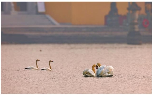近日,观海卫镇白洋湖迎来两只疣鼻天鹅和两只小天鹅,两种野生天鹅在湖中戏水觅食,这种情形难得一见。