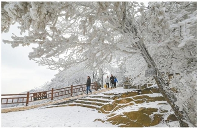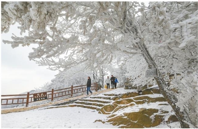 1月21日,游人在江苏连云港市海上云台山景区观赏雾凇、雪凇叠加景色。当日,江苏省连云港市海上云台山风景区出现雾凇景观,吸引众多游人前来观赏。■新华社发