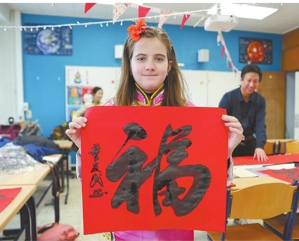 1月20日,在比利时布鲁塞尔,一名女孩在“中国日”活动上展示福字。当日,比利时欧华汉语语言学校2024年“中国日”活动在布鲁塞尔举行,通过写春联、送福字、剪纸等一系列丰富多彩的活动吸引众多中外学生前来参与体验,感受中国传统文化魅力。 ■新华社发