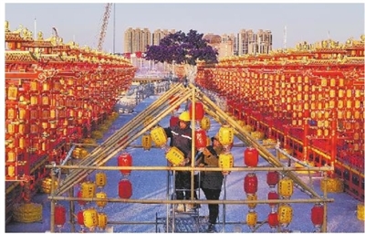 1月23日,工人在河北省唐山市丰南区河头老街景区挂灯笼(无人机照片)。春节临近,各地张灯结彩,迎新春活动丰富多彩,到处洋溢着浓浓的年味。■新华社发