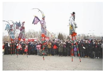 2月21日,在兰州市永登县滨河大道,永登县连城镇牛站村的社火队员在进行高跷展演。当日是农历正月十二,在甘肃省兰州市永登县举行的社火进城展演活动中,多个农村社火队的高跷展演备受关注,吸引观众到场观看,感受民俗魅力。■新华社发