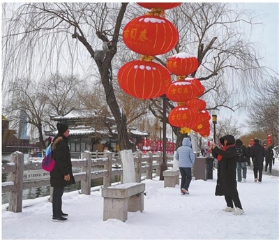 2月22日,游客在雪后大明湖畔游览。当日,山东省济南市停止降雪,雪后大明湖银装素裹,碧波荡漾,吸引不少市民和游客前来游览。 ■新华社发