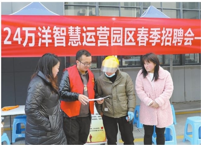 为解决辖区内就业困难人员的就业问题,同时帮助企业引才、聚才,3月2日,横河镇联合万洋众创城开展“送政策、送岗位、送温暖”专项服务活动。图为彭桥村党员志愿者为求职群众介绍就业政策。