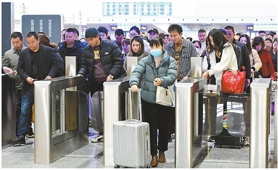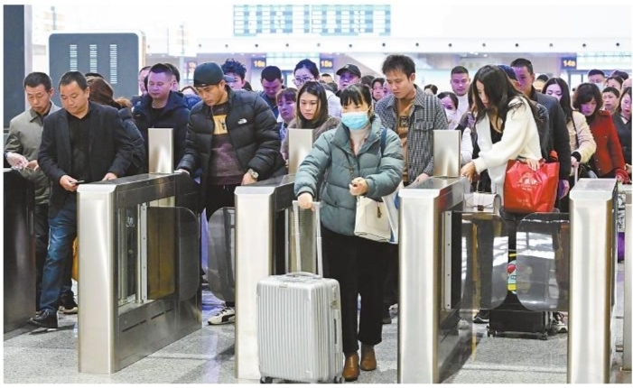 3月5日,旅客在厦门北站通过检票闸机准备登乘列车。当日,2024年春运迎来最后一天。■新华社发