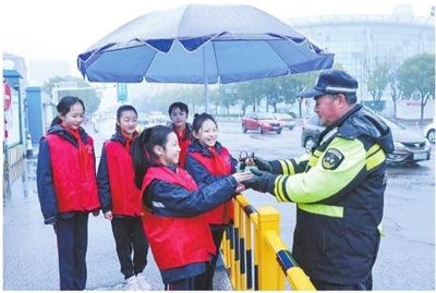 3月5日,慈溪市文谷外国语小学的5名学生代表为学校附近的辅警们送上了驱寒的姜茶,表达了对他们无论刮风下雨始终护航上学路的感激之情。 ■摄影 全媒体记者 陆铭铭 通讯员 胡晓云