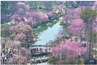 3月21日,游客在无锡太湖鼋头渚景区赏花。近日,江苏无锡太湖鼋头渚景区内的樱花陆续开放,春意盎然,人们踏青赏景,乐享春光。■新华社发