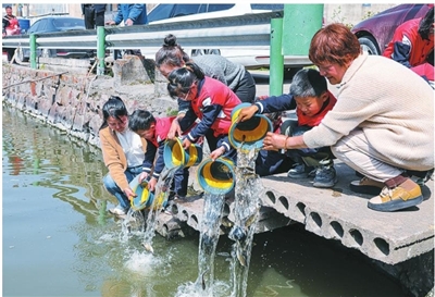 近日,横河镇新时代文明实践所、横河镇水治办联合梅湖村、梅湖幼儿园开展“童心共护水,小鱼回江河”志愿服务活动,引导孩子们节水护水。图为党员志愿者指导孩子们投放鱼苗。■摄影 全媒体记者 蒋亚军 通讯员 张朝峰