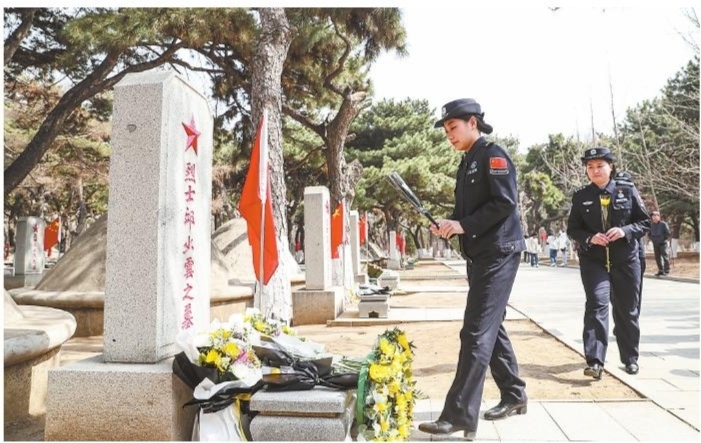 4月2日,在沈阳抗美援朝烈士陵园,沈阳出入境边防检查站民警在烈士墓碑前献花。清明节前夕,人们前往烈士陵园开展祭扫活动,向英烈敬献鲜花,寄托哀思。