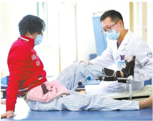 为向患者提供专业、高效、优质的康复服务,增加患者的就医渠道,慈溪市人民医院医疗健康集团康复医学科增设5个特色专病门诊,分别为“脑卒中康复门诊”“运动损伤障碍门诊”“整脊、脊柱侧弯康复门诊”“产后腰痛康复门诊”“颈肩腰腿痛康复门诊”。通过更加精细的功能评估,制定个体化康复训练方案,以“一患一案”的管理模式,为广大患者提供康复指导和长期随访。图为一患者正在医生的指导下进行运动损伤康复治疗。