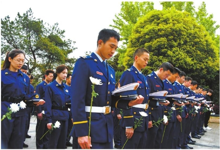 前天上午,市消防救援大队全体人员来到市革命烈士陵园,瞻仰革命烈士纪念碑,向长眠于此的革命烈士鞠躬并默哀。随后,全体消防救援人员仪容肃穆,排着整齐的队伍有序行至纪念碑前,逐一敬献鲜花,并缓步绕行纪念碑一周,表达对革命烈士的深切缅怀和崇高敬意。 ■摄影 全媒体记者 杨贯 通讯员 储天峰 马文文