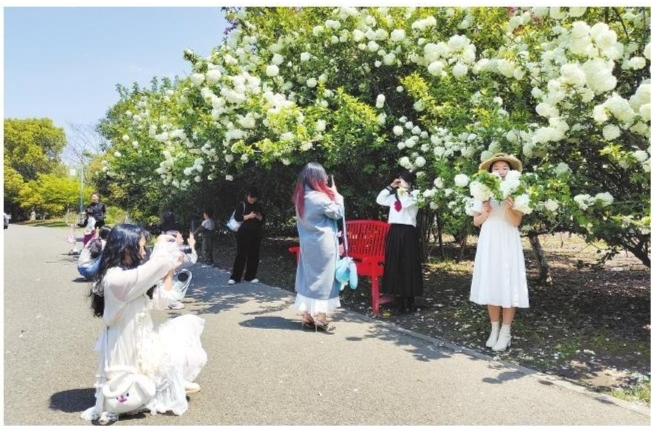 日前,随着气温升高,森林公园内的木绣球竞相绽放,一团团、一簇簇,如云似雪,美不胜收,吸引市民前来赏花打卡。 ■摄影 全媒体记者 王烨江