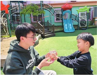 近日,观海卫镇阳光幼儿园开展拒绝酒驾宣传教育活动。孩子们化身“交通安全小卫士”,手捧茶杯提醒爸爸“喝酒不开车,喝茶更健康”。爸爸们深受触动,承诺遵守交通法规,共同维护好交通秩序。■摄影 全媒体记者 杨贯 通讯员 汤嘉莹 徐吉