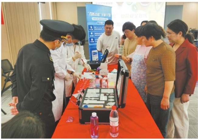 近日,市市场监督管理局联合浒山街道食安办来到鸣山社区开展“你点我检进社区”活动。现场,检测人员对小番茄、草莓、生菜、胡萝卜、小青菜等常见农产品进行农残快检,并向居民分发食品安全知识宣传册,开展食品安全知识有奖问答。 ■摄影 全媒体记者 戎志虎 通讯员 陈蜀军