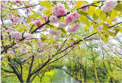 眼下,峙山公园内樱花盛开,粉色的花瓣在细雨中轻轻摇曳。微风拂过,花瓣随风而起,宛如雪花飘落,增添了几分朦胧和诗意。 ■摄影 全媒体记者 王烨江