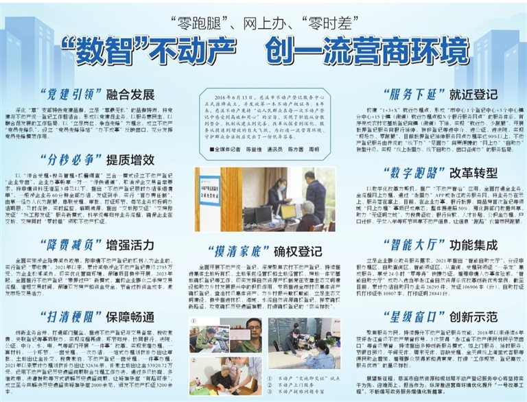 以数字化改革为契机,推广“不动产智治”应用,全面打通全业务、全流程网上办理,通过“浙里办”APP或浙江政务服务网,将业务办在云上、服务落在掌上。目前,在企业办事、银行抵押、商品房首次登记等领域“网上办理”事项已成常态,整体提速超50%。强化跨部门数据共享,助力“无证明之城”,为税费征收、银行贷款、人才补贴、公积金办理、户口迁移、子女入学等环节共享不动产信息,让信息“跑路”代替市民跑腿。