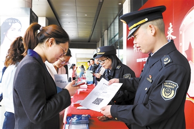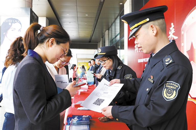4月22日下午,市市场监管局、市人民法院、市公安局等部门在银泰商场联合开展“4·26世界知识产权日”宣传活动,通过户外宣传、提供现场咨询、发放宣传资料等形式向社会大众普及知识产权法律法规,提高全社会保护知识产权意识。 ■摄影 全媒体记者 王烨江 通讯员 胡东映