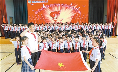 5月30日,市文谷外国语小学举行一年级学生入队仪式,150名小谷粒光荣加入中国少年先锋队。在队旗的引领下,他们举起右拳,立志践行誓言,为红领巾增光,为祖国添彩,为共产主义事业贡献力量。 ■摄影 全媒体记者 陆铭铭 通讯员 胡晓云