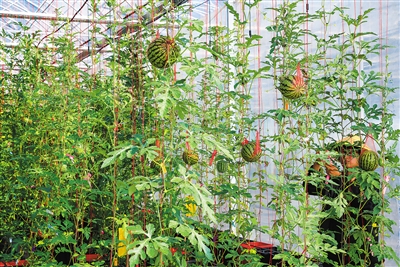 与普通西瓜栽培方式不同,“天使1号”是立体式种植的。一排排西瓜像是“住进”了空中阁楼。在向上蔓延碧绿的瓜藤中,一个个拳头大小的西瓜凌空悬挂其中,煞是可爱。