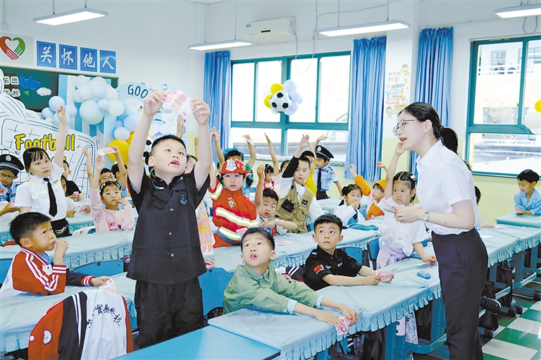 5月31日,慈吉实验学校小学部(北校区)举办了“职业体验日”六一主题活动,慈溪农商行为109班的小学生带来了一堂生动活泼的银行职业课。在互动中,小朋友们学习了人民币发展历史以及如何辨别假币等金融知识,培养良好的理财习惯。 ■摄影 全媒体记者 胡杭燕 通讯员 孙杉杉