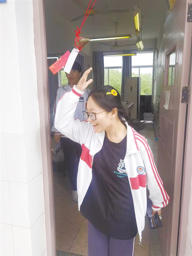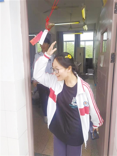 今年高考正逢端午佳节,不少考生家长、教师都会讨一个一举高“粽”的好彩头,在实验高中的临时休息教室,老师们昨天一大早就在教室门口悬挂了绑有红色丝带的粽子,考生们纷纷用头去“撞”粽子,互相加油鼓劲,祝愿高考顺利。
