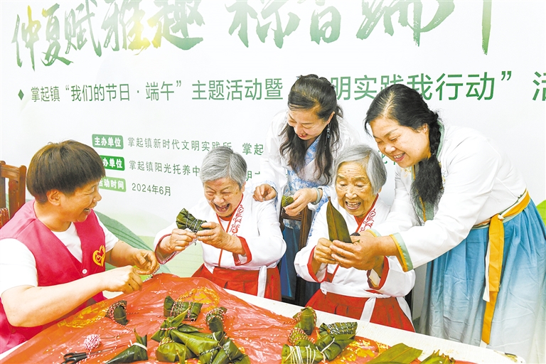 近日,掌起镇邹黎明志愿服务队志愿者和阳光托养中心的老人们欢聚一堂,开展着汉服、包粽子、缝香包、扎菖蒲等民俗活动,老少同乐喜迎端午。