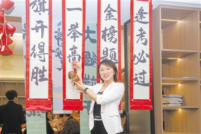 端午节遇上高考日,一举高“粽”、不负“粽”望、“高考遇端午,全上985”等词句开始流行起来。图为滨河社区一楼大堂内高考生及中考生的家长们为考生们送上祝福,祈愿考生们取得佳绩。■摄影 全媒体记者 黄凯