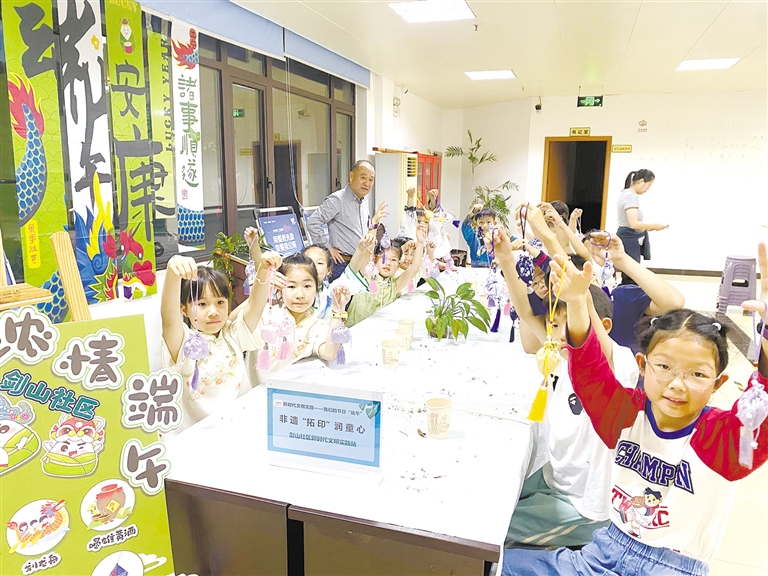 端午节来临之际,浒山街道剑山社区组织开展“非遗拓印润童心”活动。现场,孩子们亲手制作精美驱蚊香囊和拓印画,感受到了传统文化的魅力,脸上满是成就感。